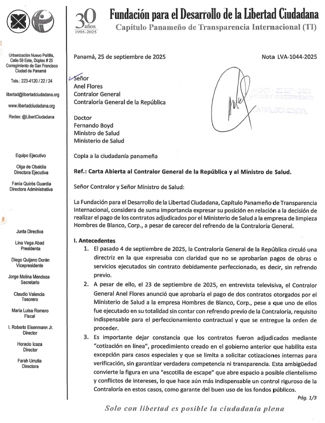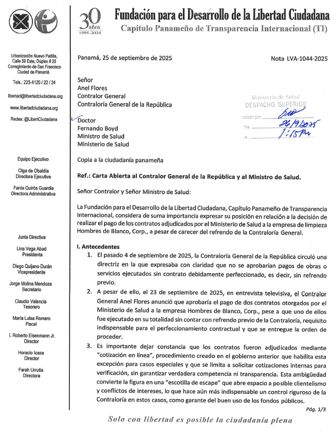 La Fundación para el Desarrollo de la Libertad Ciudadana, Capítulo Panameño de Transparencia Internacional, considera de suma importancia expresar su posición en relación a la decisión de realizar el pago de los contratos adjudicados por el Ministerio de Salud a la empresa de limpieza Hombres de Blanco, Corp., a pesar de carecer del refrendo de la Contraloría General.